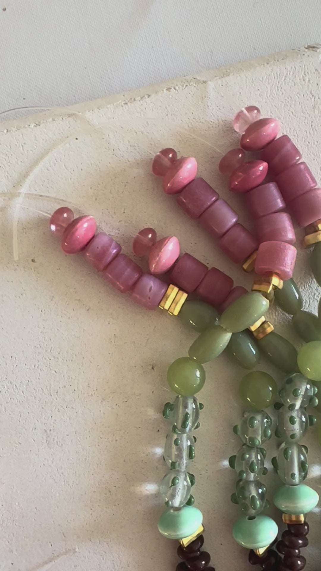 materials: indonesian glass, porcelain, wood, coconut + brass beads