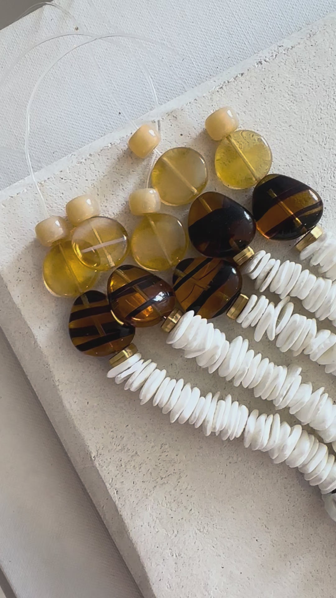 materials: vintage czech beads, howlite, shell, ceramic + brass beads